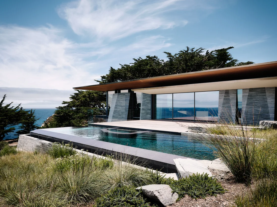 The house is comprised of a series of slender roofs that appear to float above the massive stone walls which connect the building to the ground.